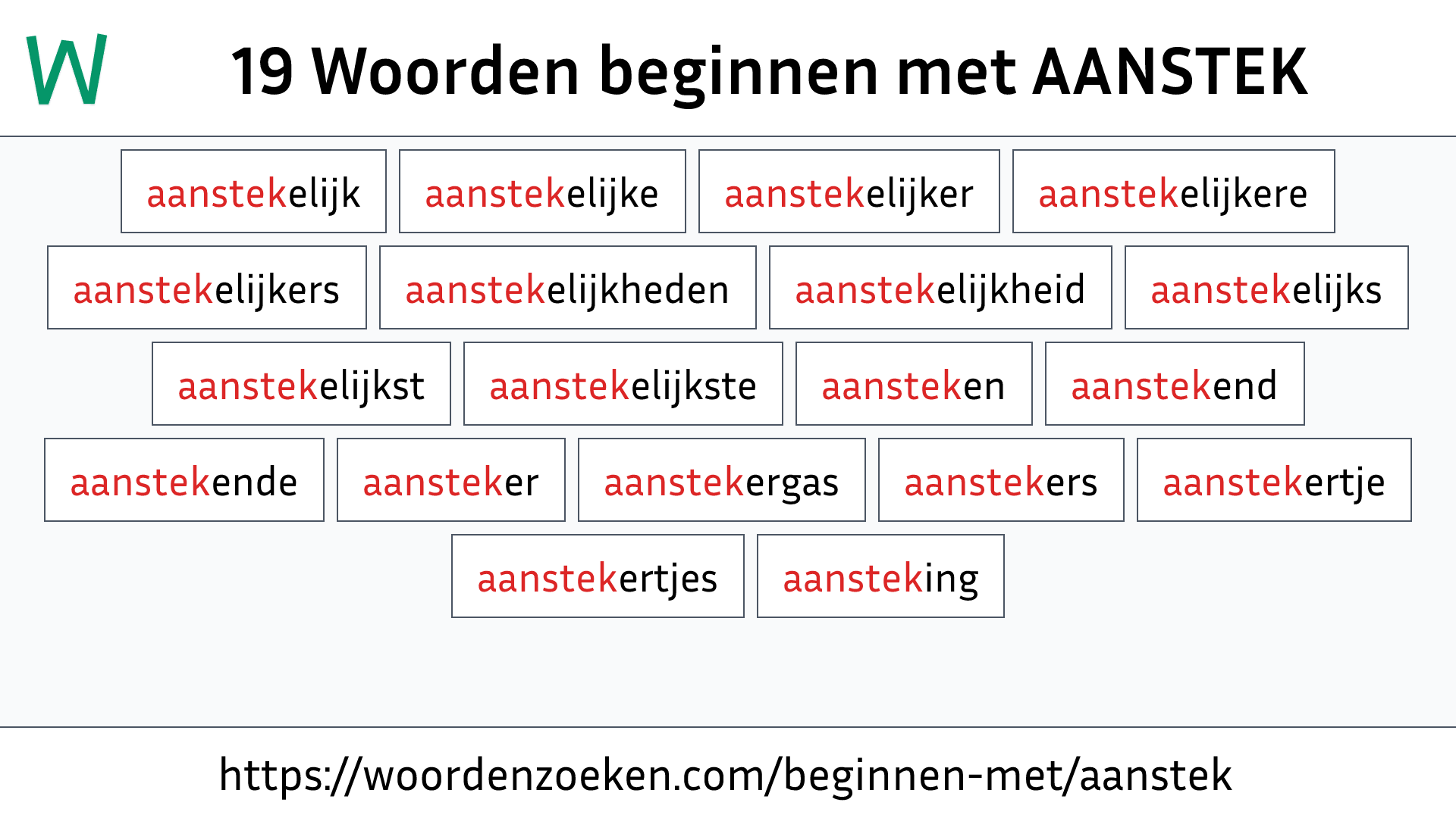 Hieronder staat een lijst van 19 Nederlandse woorden beginnen met AANSTEK. Als je spellen speelt zoals Wordfeud, Scrabble, uitdagende kruiswoordpuzzels maakt, of op zoek bent naar een specifiek woord, dan kan deze lijst handig voor je zijn. Wil je de zoekfilters aanpassen om meer woorden te bevatten of een specifiek woord te vinden? Wijzig de filters in het formulier op deze pagina en klik op "Zoeken".
