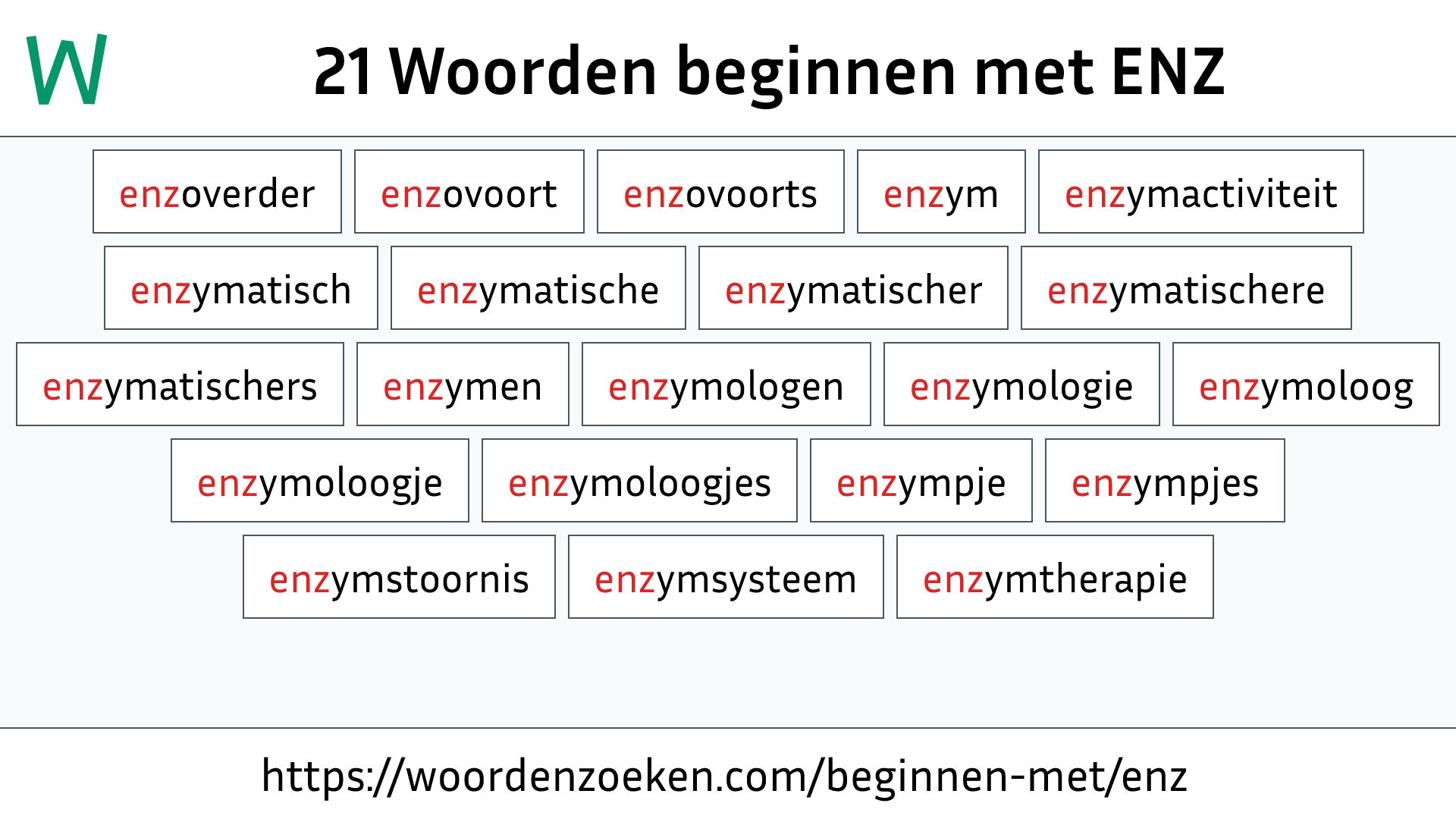 Hieronder staat een lijst van 21 Nederlandse woorden beginnen met ENZ. Als je spellen speelt zoals Wordfeud, Scrabble, uitdagende kruiswoordpuzzels maakt, of op zoek bent naar een specifiek woord, dan kan deze lijst handig voor je zijn. Wil je de zoekfilters aanpassen om meer woorden te bevatten of een specifiek woord te vinden? Wijzig de filters in het formulier op deze pagina en klik op "Zoeken".
