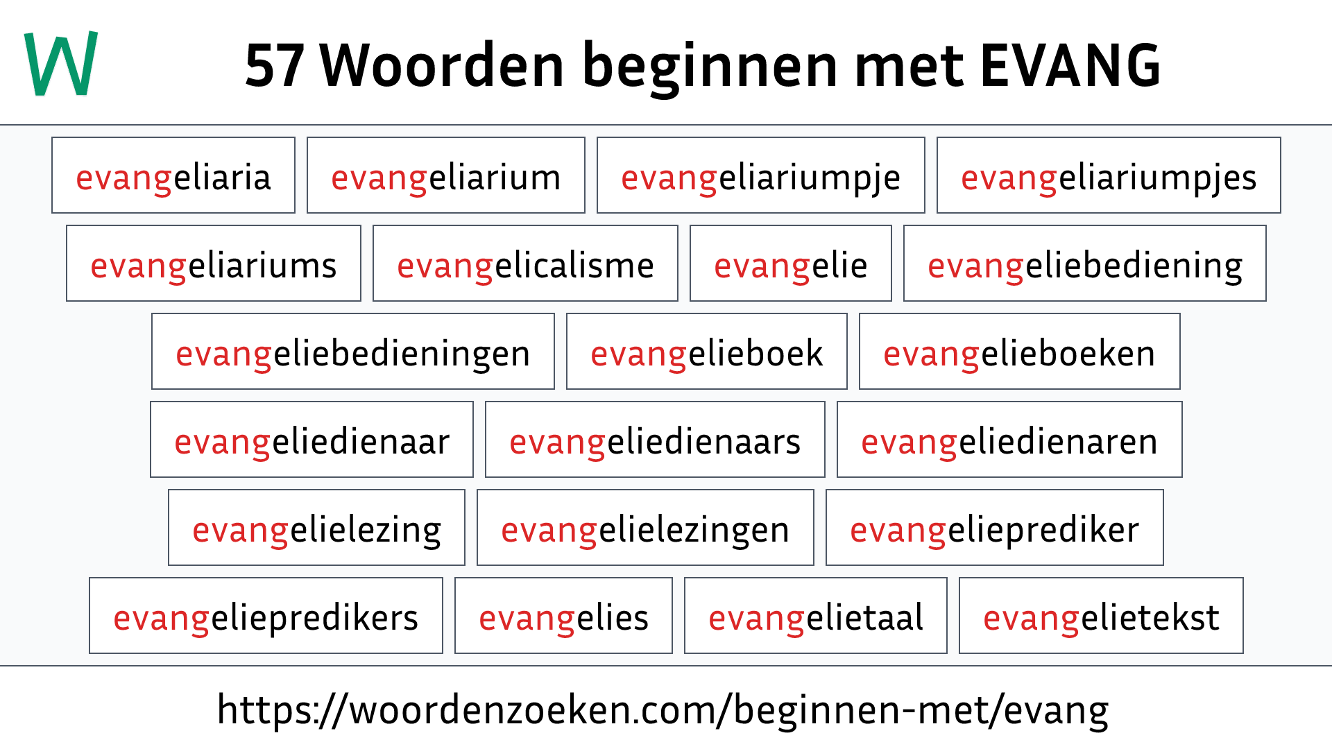 Hieronder staat een lijst van 57 Nederlandse woorden beginnen met EVANG. Als je spellen speelt zoals Wordfeud, Scrabble, uitdagende kruiswoordpuzzels maakt, of op zoek bent naar een specifiek woord, dan kan deze lijst handig voor je zijn. Wil je de zoekfilters aanpassen om meer woorden te bevatten of een specifiek woord te vinden? Wijzig de filters in het formulier op deze pagina en klik op "Zoeken".