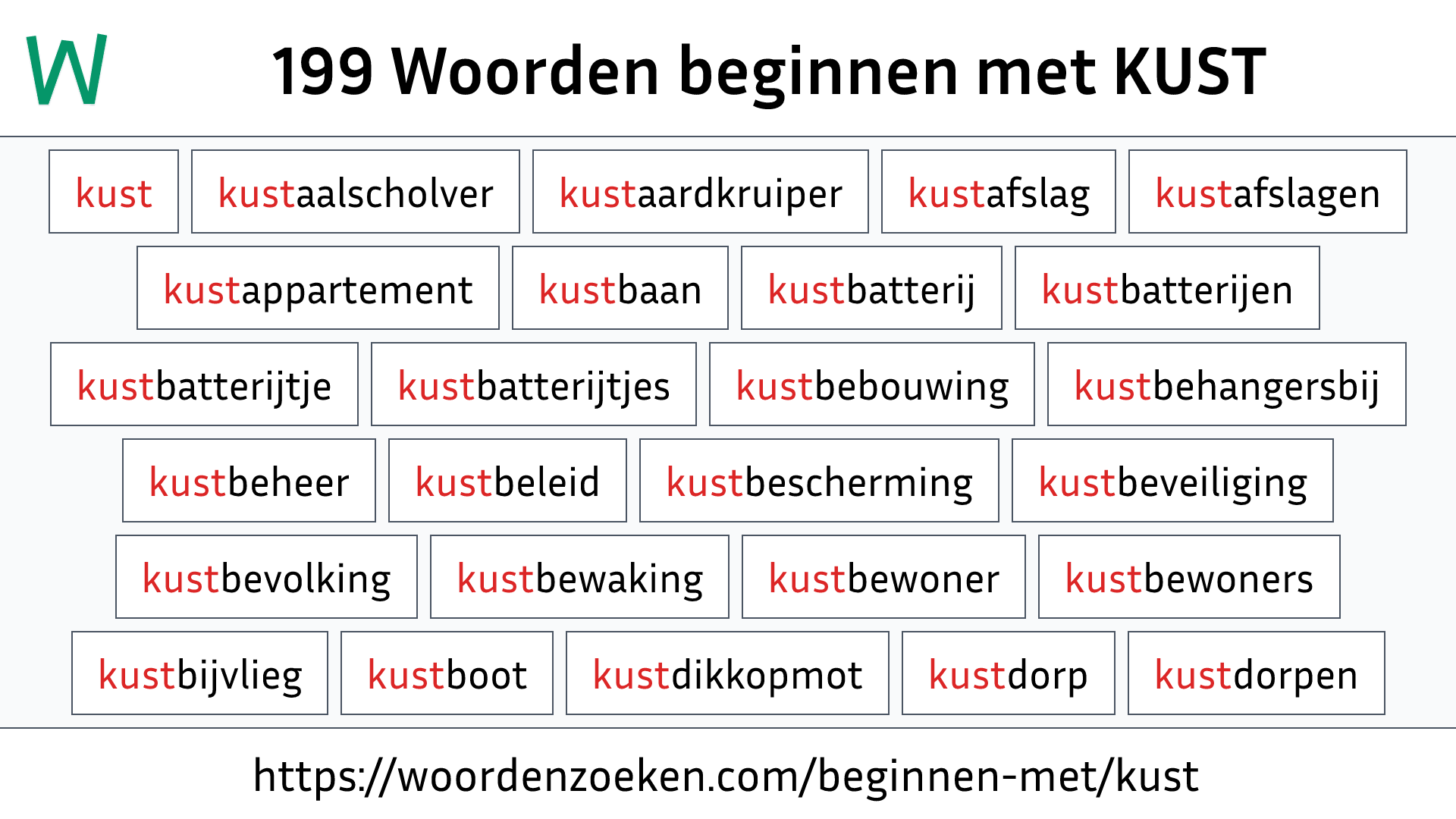 Hieronder staat een lijst van 199 Nederlandse woorden beginnen met KUST. Als je spellen speelt zoals Wordfeud, Scrabble, uitdagende kruiswoordpuzzels maakt, of op zoek bent naar een specifiek woord, dan kan deze lijst handig voor je zijn. Wil je de zoekfilters aanpassen om meer woorden te bevatten of een specifiek woord te vinden? Wijzig de filters in het formulier op deze pagina en klik op "Zoeken".