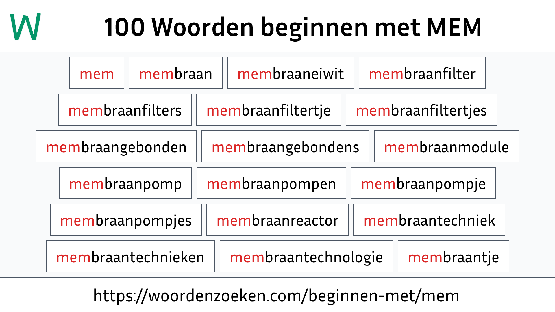 Hieronder staat een lijst van 100 Nederlandse woorden beginnen met MEM. Als je spellen speelt zoals Wordfeud, Scrabble, uitdagende kruiswoordpuzzels maakt, of op zoek bent naar een specifiek woord, dan kan deze lijst handig voor je zijn. Wil je de zoekfilters aanpassen om meer woorden te bevatten of een specifiek woord te vinden? Wijzig de filters in het formulier op deze pagina en klik op "Zoeken".