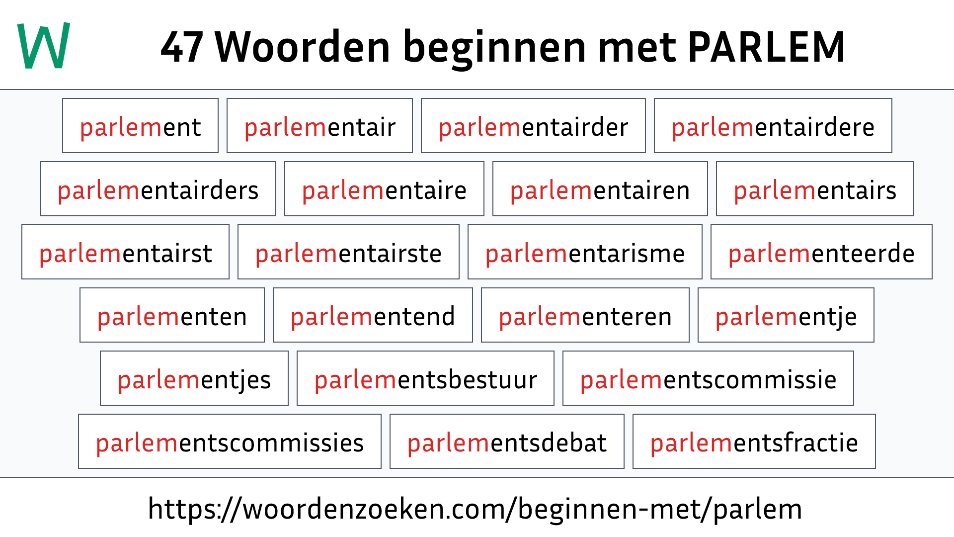 Hieronder staat een lijst van 47 Nederlandse woorden beginnen met PARLEM. Als je spellen speelt zoals Wordfeud, Scrabble, uitdagende kruiswoordpuzzels maakt, of op zoek bent naar een specifiek woord, dan kan deze lijst handig voor je zijn. Wil je de zoekfilters aanpassen om meer woorden te bevatten of een specifiek woord te vinden? Wijzig de filters in het formulier op deze pagina en klik op "Zoeken".