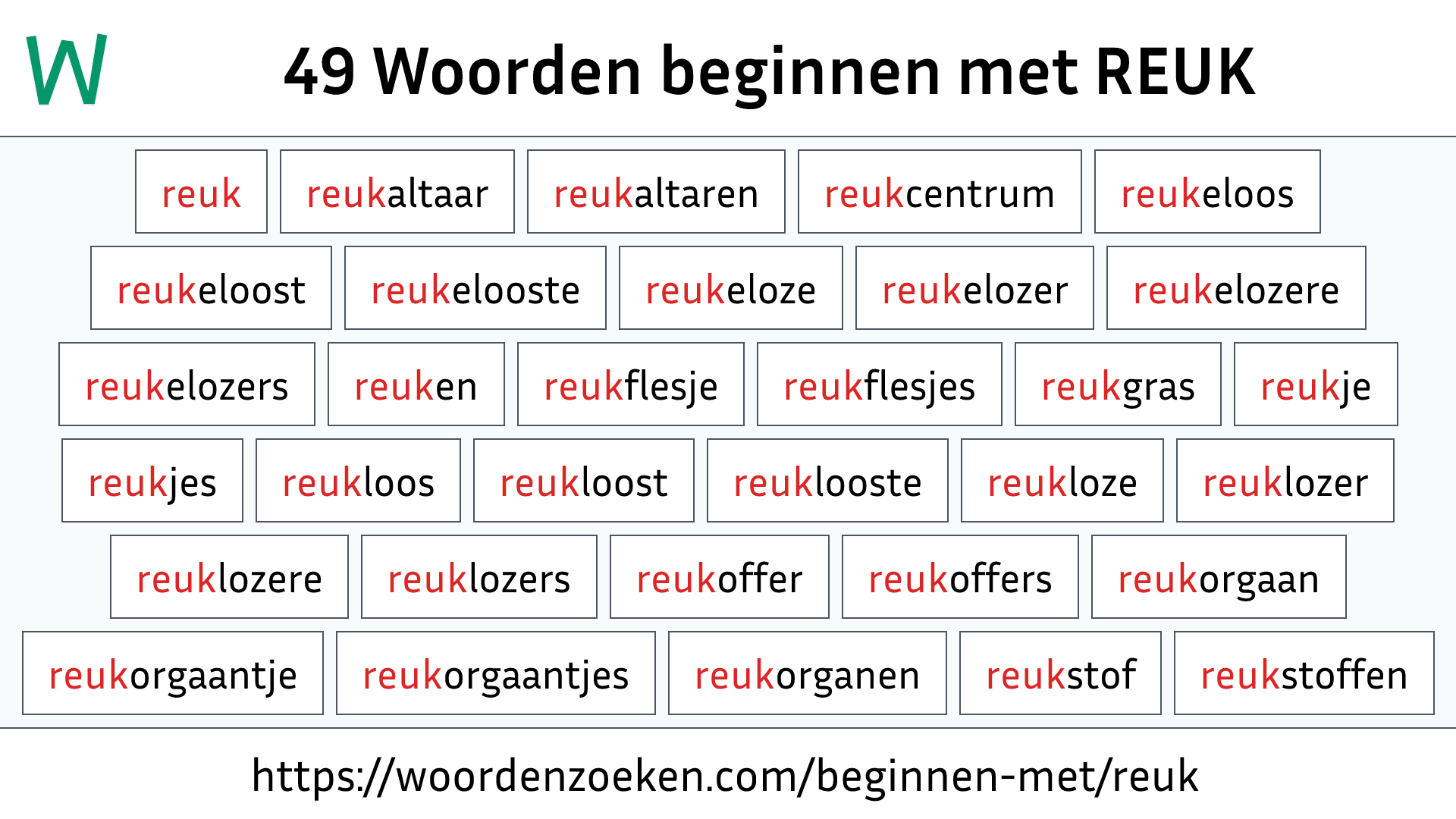 Hieronder staat een lijst van 49 Nederlandse woorden beginnen met REUK. Als je spellen speelt zoals Wordfeud, Scrabble, uitdagende kruiswoordpuzzels maakt, of op zoek bent naar een specifiek woord, dan kan deze lijst handig voor je zijn. Wil je de zoekfilters aanpassen om meer woorden te bevatten of een specifiek woord te vinden? Wijzig de filters in het formulier op deze pagina en klik op "Zoeken".