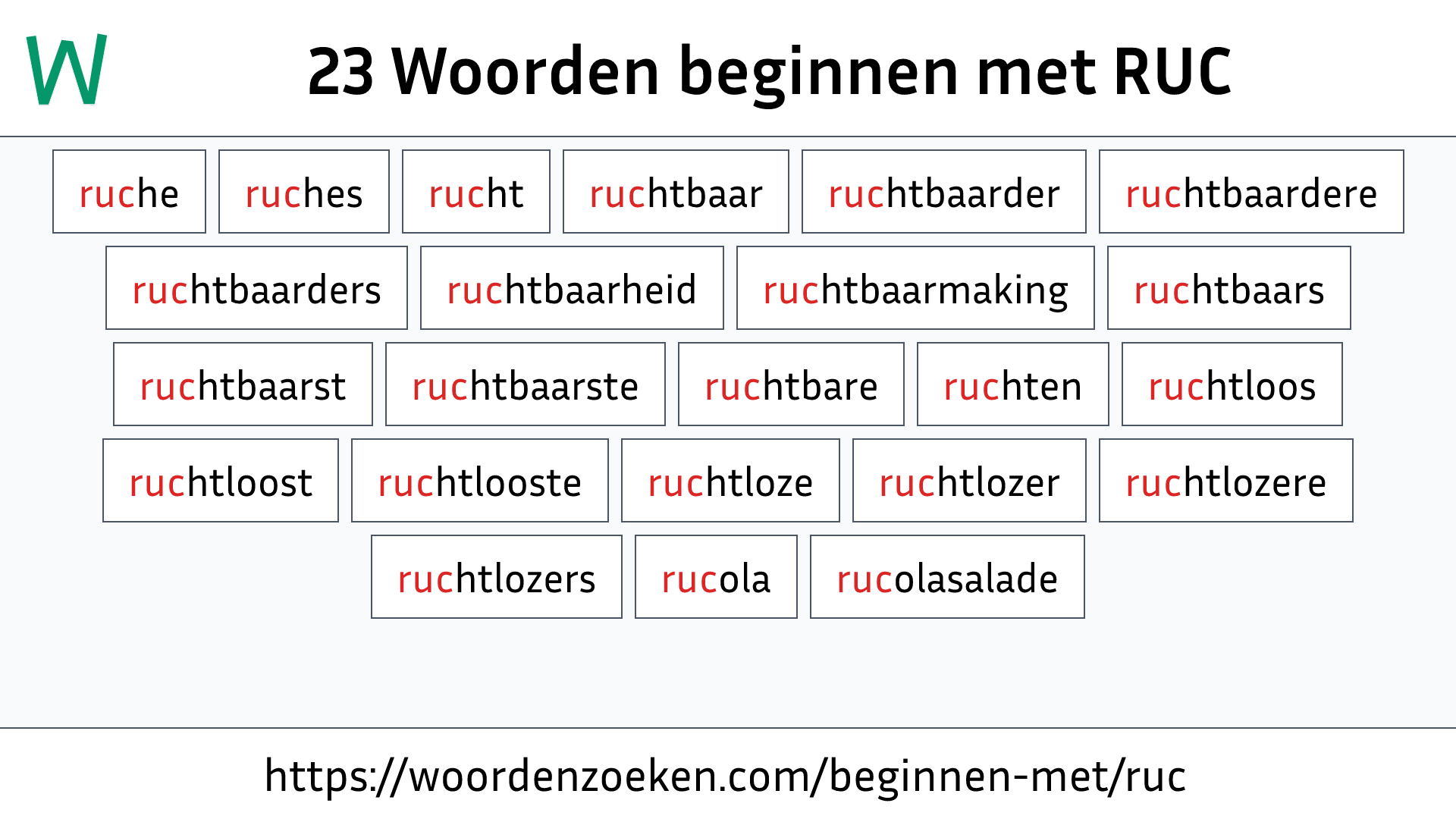 Hieronder staat een lijst van 23 Nederlandse woorden beginnen met RUC. Als je spellen speelt zoals Wordfeud, Scrabble, uitdagende kruiswoordpuzzels maakt, of op zoek bent naar een specifiek woord, dan kan deze lijst handig voor je zijn. Wil je de zoekfilters aanpassen om meer woorden te bevatten of een specifiek woord te vinden? Wijzig de filters in het formulier op deze pagina en klik op "Zoeken".