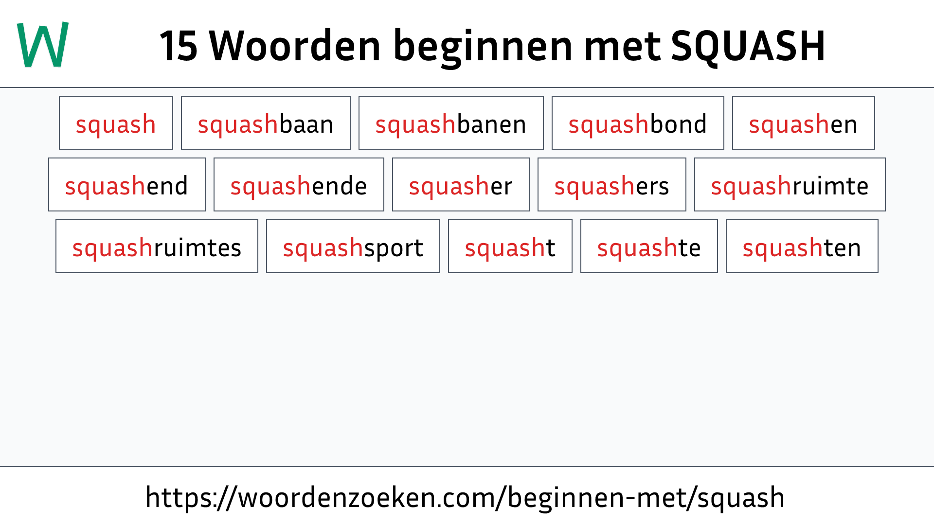 Zie ook: Woorden eindigen op SQUASH, Woorden met SQUASH, Woorden beginnen met SQUAS.