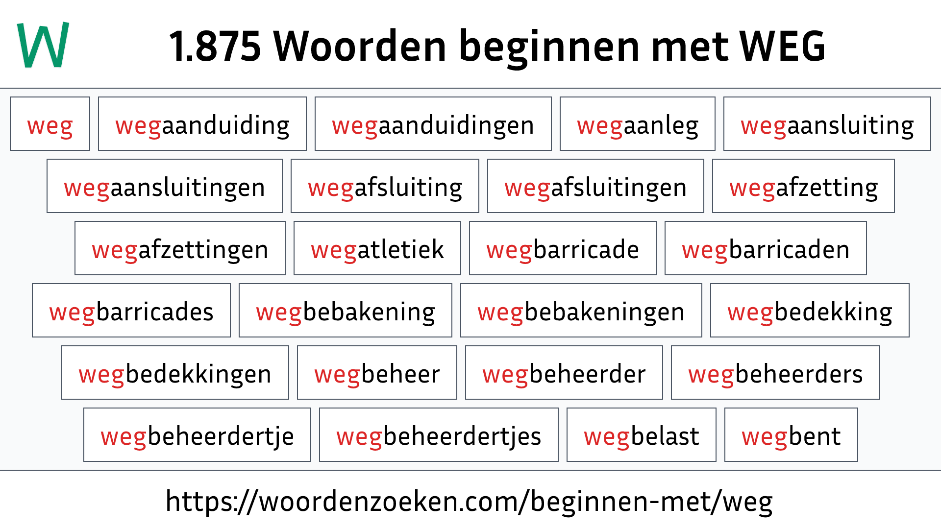 Hieronder staat een lijst van 1.875 Nederlandse woorden beginnen met WEG. Als je spellen speelt zoals Wordfeud, Scrabble, uitdagende kruiswoordpuzzels maakt, of op zoek bent naar een specifiek woord, dan kan deze lijst handig voor je zijn. Wil je de zoekfilters aanpassen om meer woorden te bevatten of een specifiek woord te vinden? Wijzig de filters in het formulier op deze pagina en klik op "Zoeken".