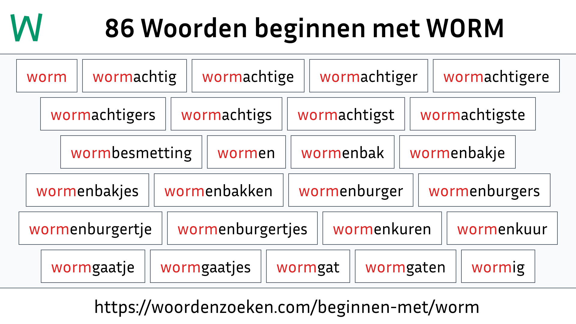 Zie ook: Woorden eindigen op WORM, Woorden met WORM, Woorden beginnen met WOR.