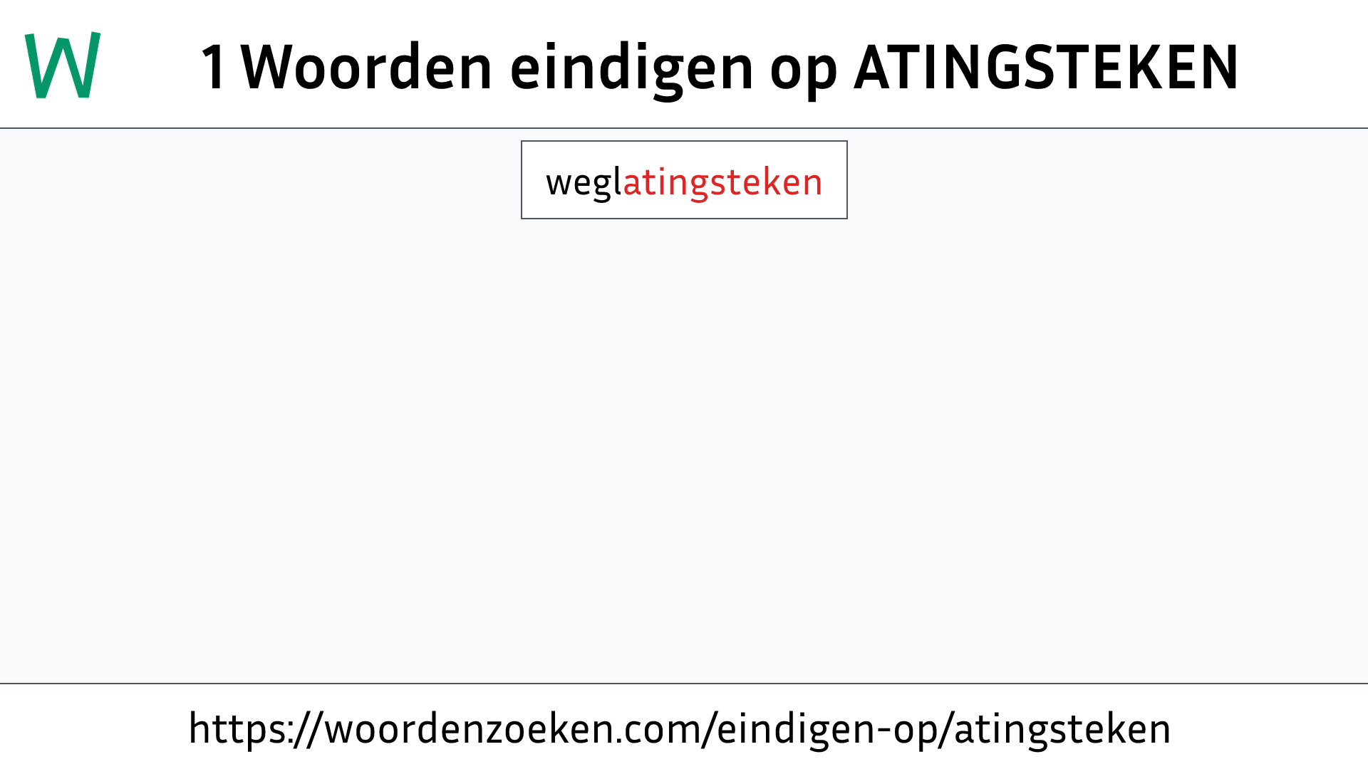 Hieronder staat een lijst van 1 Nederlandse woorden eindigen op ATINGSTEKEN. Als je spellen speelt zoals Wordfeud, Scrabble, uitdagende kruiswoordpuzzels maakt, of op zoek bent naar een specifiek woord, dan kan deze lijst handig voor je zijn. Wil je de zoekfilters aanpassen om meer woorden te bevatten of een specifiek woord te vinden? Wijzig de filters in het formulier op deze pagina en klik op "Zoeken".