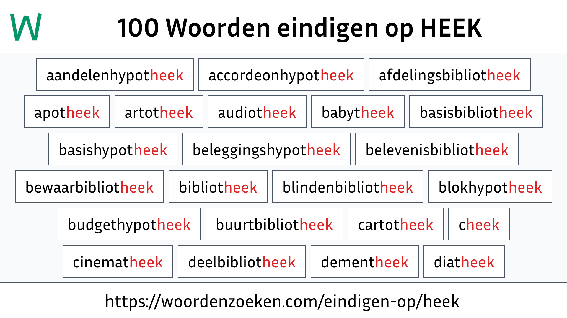 Hieronder staat een lijst van 100 Nederlandse woorden eindigen op HEEK. Als je spellen speelt zoals Wordfeud, Scrabble, uitdagende kruiswoordpuzzels maakt, of op zoek bent naar een specifiek woord, dan kan deze lijst handig voor je zijn. Wil je de zoekfilters aanpassen om meer woorden te bevatten of een specifiek woord te vinden? Wijzig de filters in het formulier op deze pagina en klik op "Zoeken".