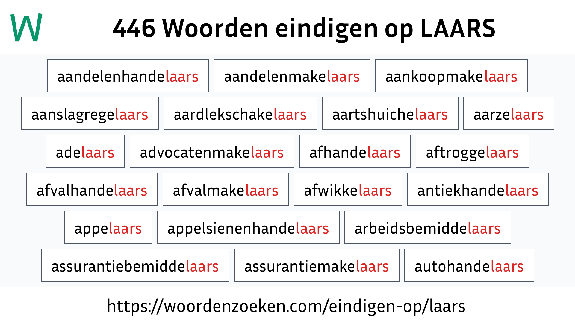 Hieronder staat een lijst van 446 Nederlandse woorden eindigen op LAARS. Als je spellen speelt zoals Wordfeud, Scrabble, uitdagende kruiswoordpuzzels maakt, of op zoek bent naar een specifiek woord, dan kan deze lijst handig voor je zijn. Wil je de zoekfilters aanpassen om meer woorden te bevatten of een specifiek woord te vinden? Wijzig de filters in het formulier op deze pagina en klik op "Zoeken".