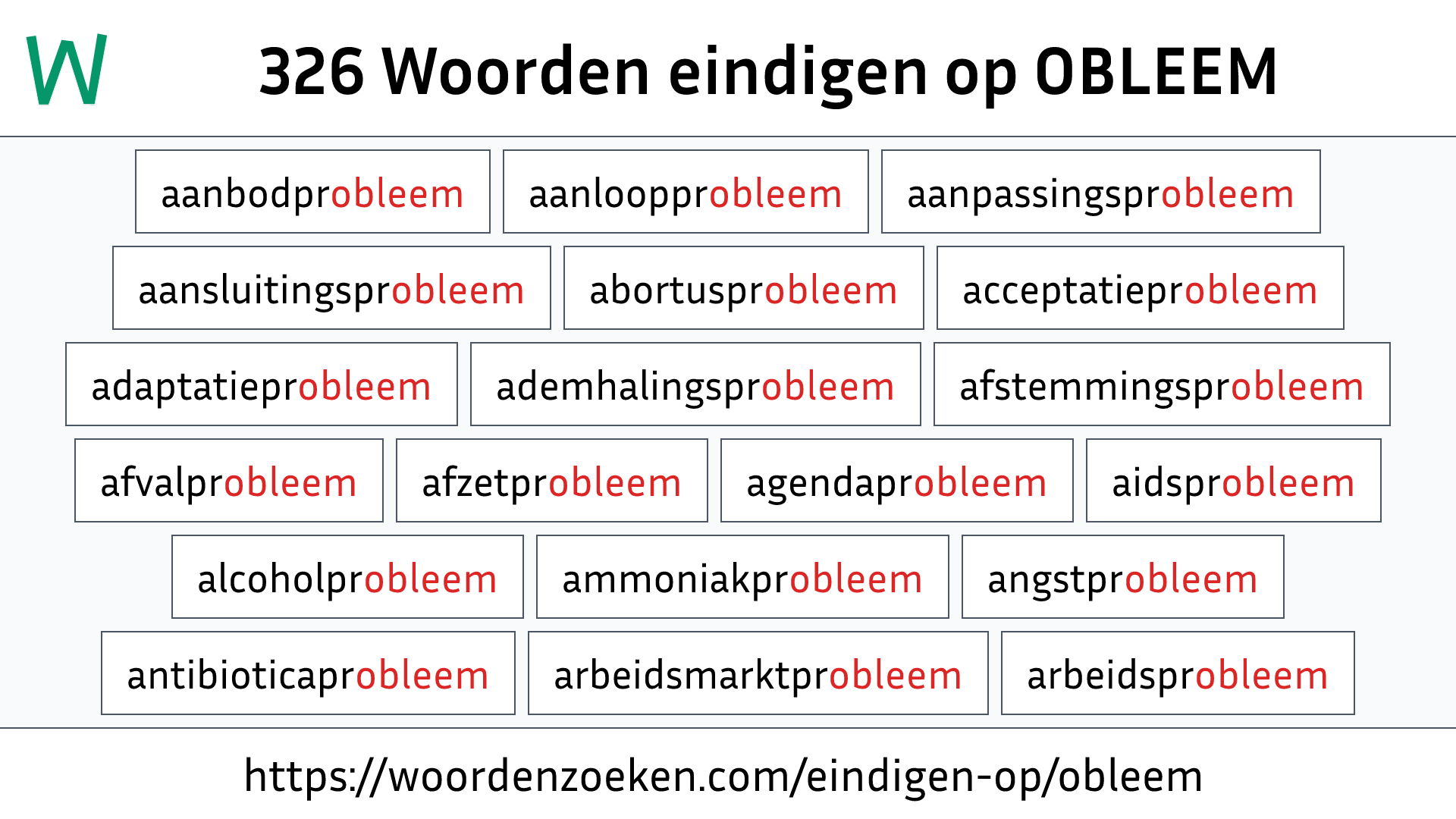 Hieronder staat een lijst van 326 Nederlandse woorden eindigen op OBLEEM. Als je spellen speelt zoals Wordfeud, Scrabble, uitdagende kruiswoordpuzzels maakt, of op zoek bent naar een specifiek woord, dan kan deze lijst handig voor je zijn. Wil je de zoekfilters aanpassen om meer woorden te bevatten of een specifiek woord te vinden? Wijzig de filters in het formulier op deze pagina en klik op "Zoeken".