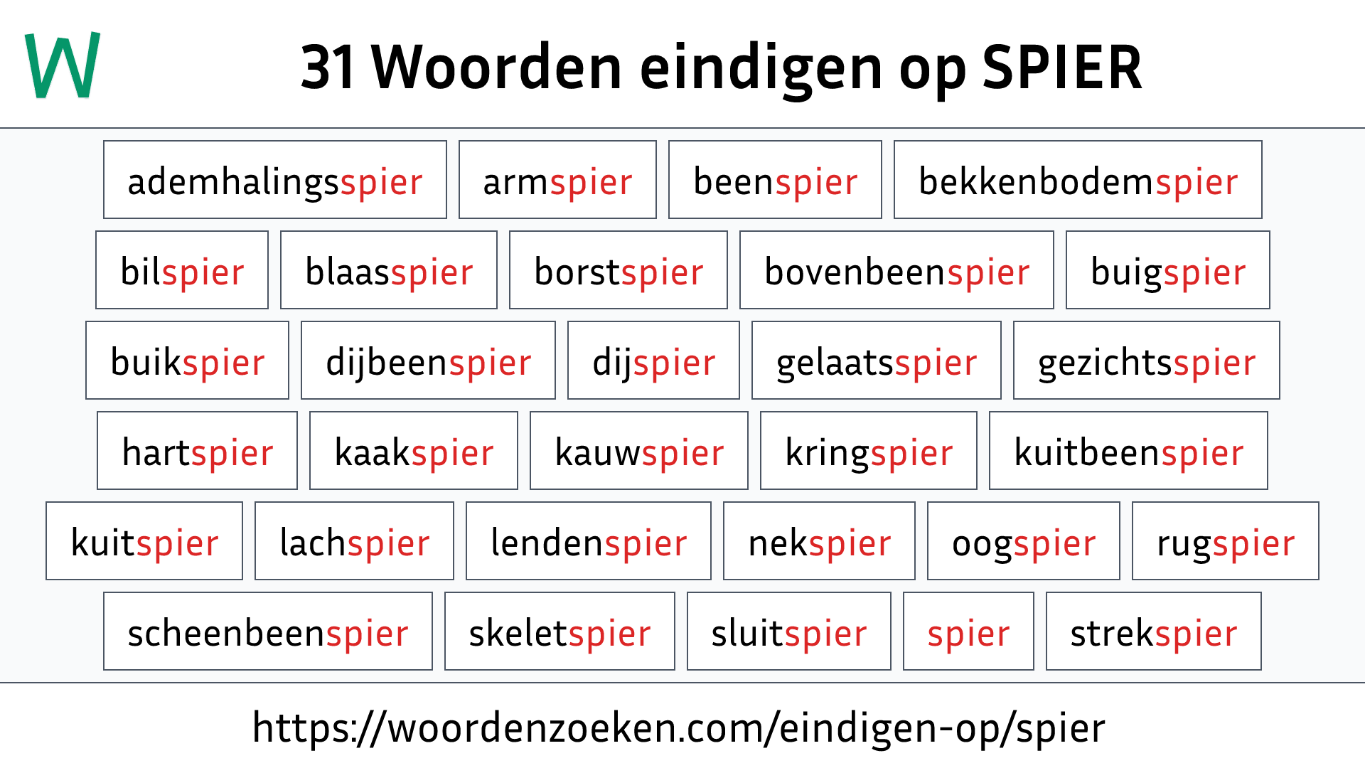 Zie ook: Woorden beginnen met SPIER, Woorden met SPIER, Woorden eindigen op PIER.