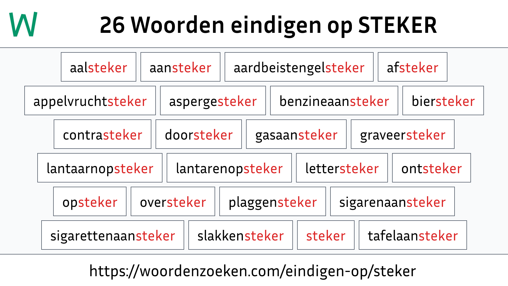 Hieronder staat een lijst van 26 Nederlandse woorden eindigen op STEKER. Als je spellen speelt zoals Wordfeud, Scrabble, uitdagende kruiswoordpuzzels maakt, of op zoek bent naar een specifiek woord, dan kan deze lijst handig voor je zijn. Wil je de zoekfilters aanpassen om meer woorden te bevatten of een specifiek woord te vinden? Wijzig de filters in het formulier op deze pagina en klik op "Zoeken".
