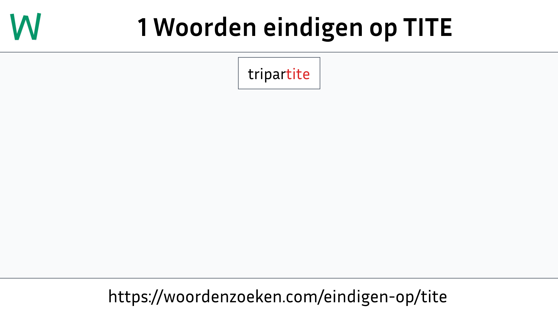 Hieronder staat een lijst van 1 Nederlandse woorden eindigen op TITE. Als je spellen speelt zoals Wordfeud, Scrabble, uitdagende kruiswoordpuzzels maakt, of op zoek bent naar een specifiek woord, dan kan deze lijst handig voor je zijn. Wil je de zoekfilters aanpassen om meer woorden te bevatten of een specifiek woord te vinden? Wijzig de filters in het formulier op deze pagina en klik op "Zoeken".