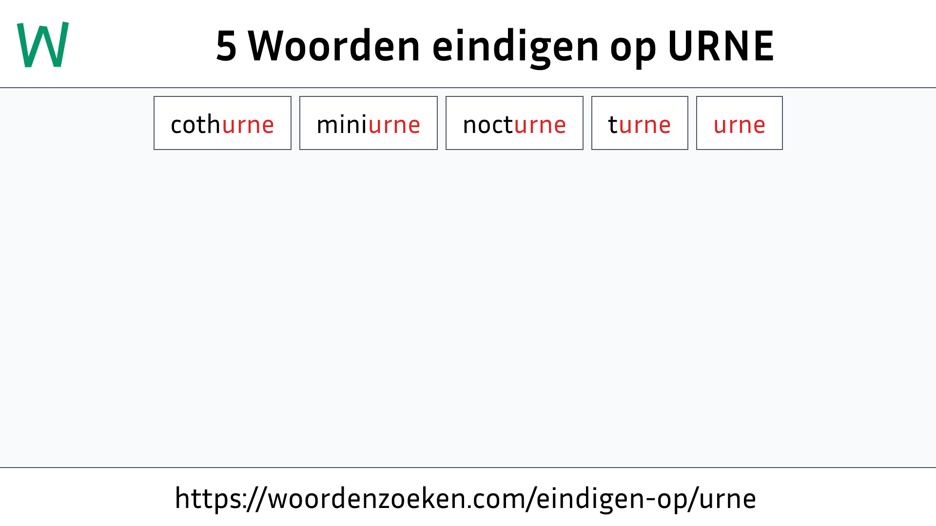 Hieronder staat een lijst van 5 Nederlandse woorden eindigen op URNE. Als je spellen speelt zoals Wordfeud, Scrabble, uitdagende kruiswoordpuzzels maakt, of op zoek bent naar een specifiek woord, dan kan deze lijst handig voor je zijn. Wil je de zoekfilters aanpassen om meer woorden te bevatten of een specifiek woord te vinden? Wijzig de filters in het formulier op deze pagina en klik op "Zoeken".