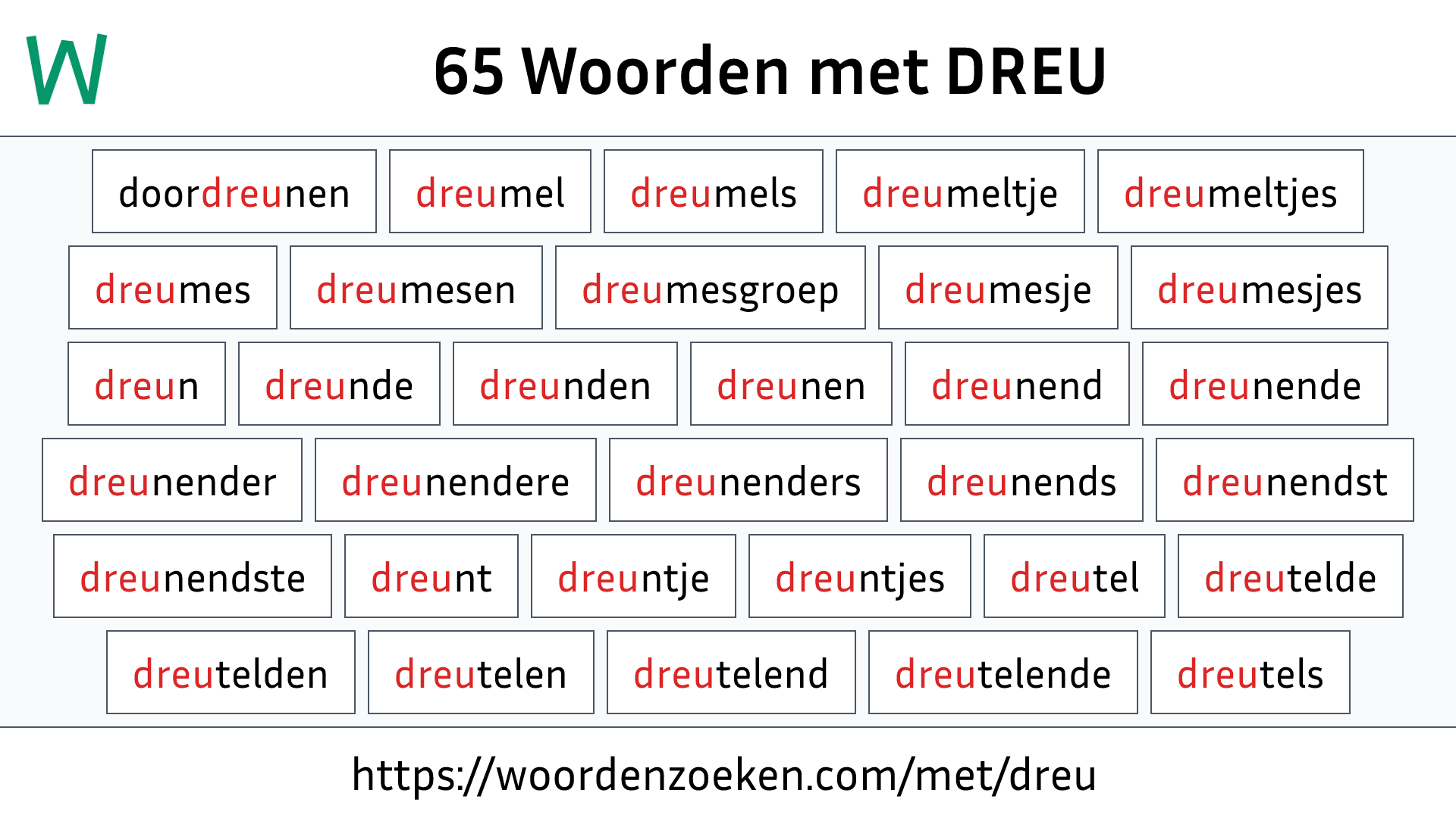 Hieronder staat een lijst van 65 Nederlandse woorden met DREU. Als je spellen speelt zoals Wordfeud, Scrabble, uitdagende kruiswoordpuzzels maakt, of op zoek bent naar een specifiek woord, dan kan deze lijst handig voor je zijn. Wil je de zoekfilters aanpassen om meer woorden te bevatten of een specifiek woord te vinden? Wijzig de filters in het formulier op deze pagina en klik op "Zoeken".