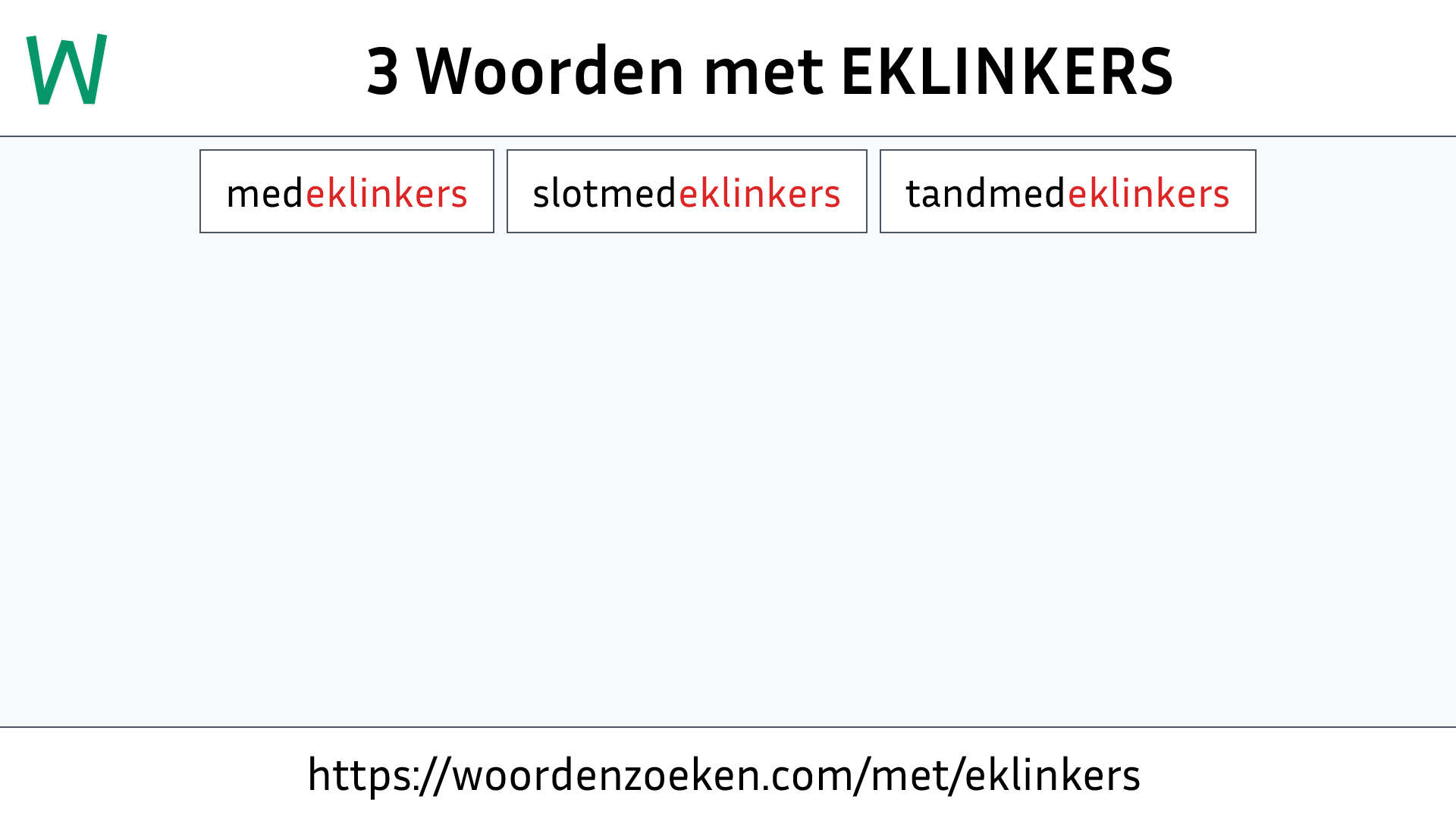 Hieronder staat een lijst van 3 Nederlandse woorden met EKLINKERS. Als je spellen speelt zoals Wordfeud, Scrabble, uitdagende kruiswoordpuzzels maakt, of op zoek bent naar een specifiek woord, dan kan deze lijst handig voor je zijn. Wil je de zoekfilters aanpassen om meer woorden te bevatten of een specifiek woord te vinden? Wijzig de filters in het formulier op deze pagina en klik op "Zoeken".