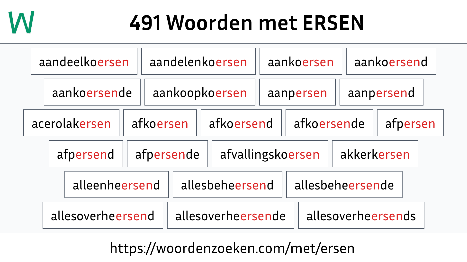 Hieronder staat een lijst van 491 Nederlandse woorden met ERSEN. Als je spellen speelt zoals Wordfeud, Scrabble, uitdagende kruiswoordpuzzels maakt, of op zoek bent naar een specifiek woord, dan kan deze lijst handig voor je zijn. Wil je de zoekfilters aanpassen om meer woorden te bevatten of een specifiek woord te vinden? Wijzig de filters in het formulier op deze pagina en klik op "Zoeken".