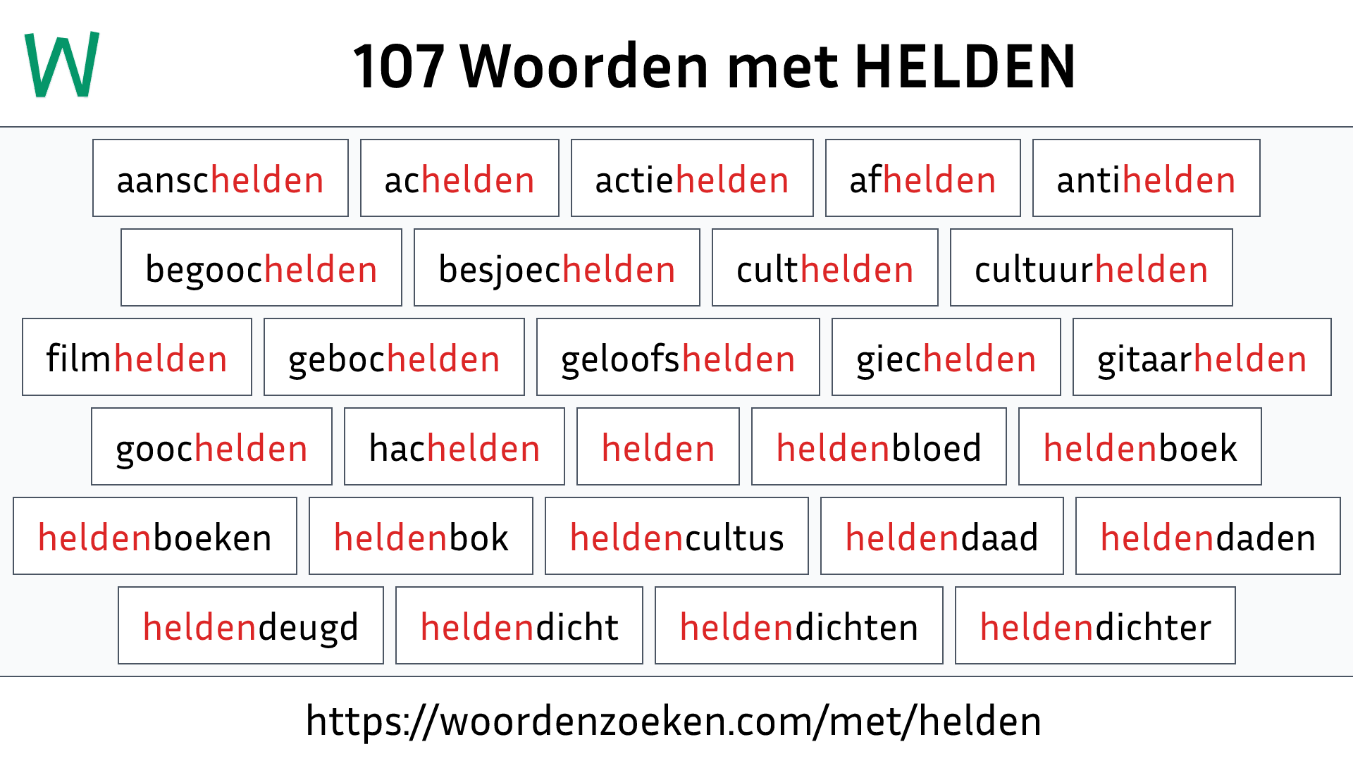 Hieronder staat een lijst van 107 Nederlandse woorden met HELDEN. Als je spellen speelt zoals Wordfeud, Scrabble, uitdagende kruiswoordpuzzels maakt, of op zoek bent naar een specifiek woord, dan kan deze lijst handig voor je zijn. Wil je de zoekfilters aanpassen om meer woorden te bevatten of een specifiek woord te vinden? Wijzig de filters in het formulier op deze pagina en klik op "Zoeken".