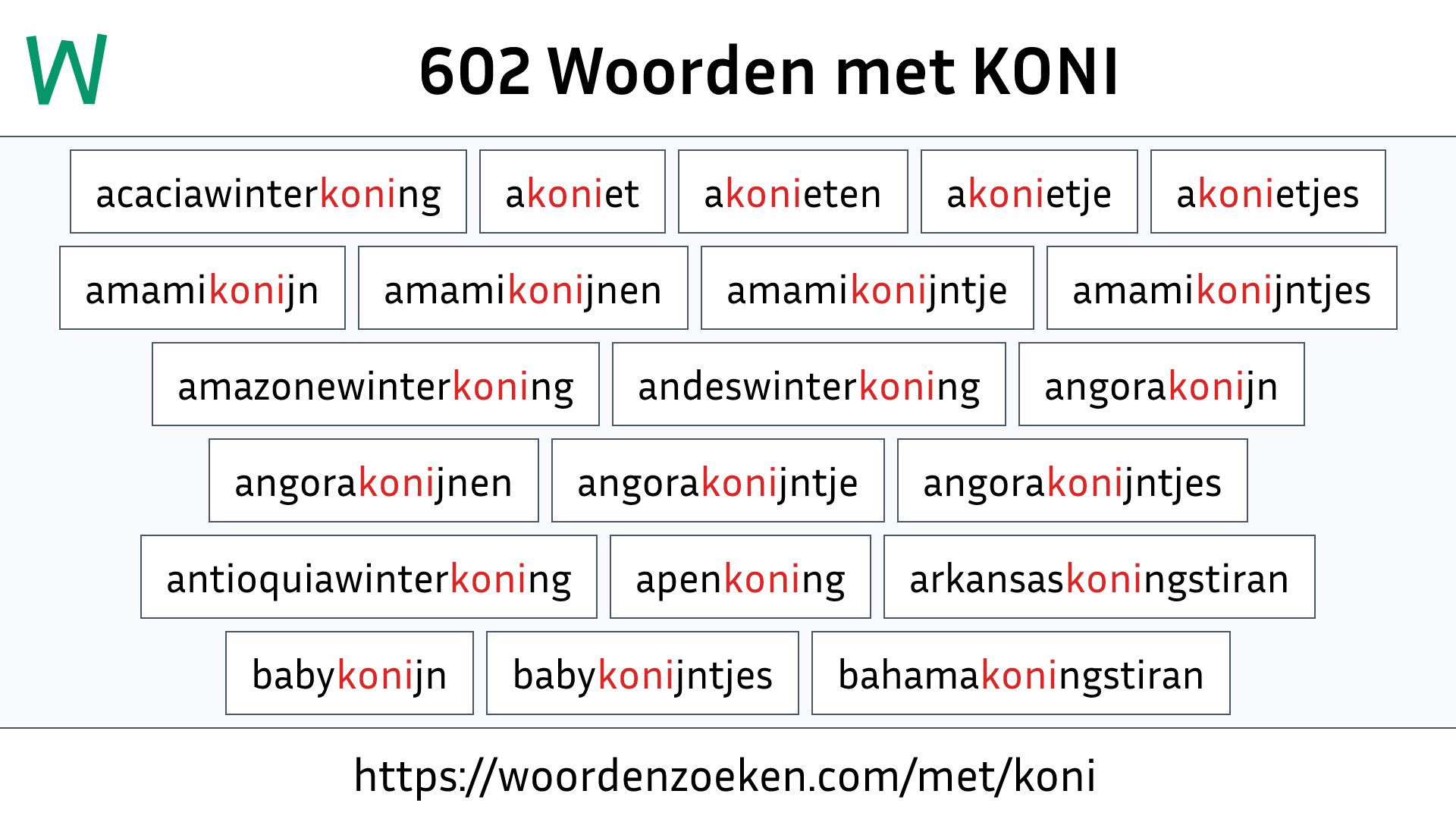 Hieronder staat een lijst van 602 Nederlandse woorden met KONI. Als je spellen speelt zoals Wordfeud, Scrabble, uitdagende kruiswoordpuzzels maakt, of op zoek bent naar een specifiek woord, dan kan deze lijst handig voor je zijn. Wil je de zoekfilters aanpassen om meer woorden te bevatten of een specifiek woord te vinden? Wijzig de filters in het formulier op deze pagina en klik op "Zoeken".