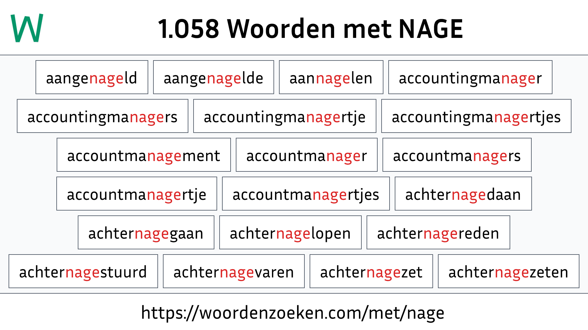 Zie ook: Woorden beginnen met NAGE, Woorden eindigen op NAGE.