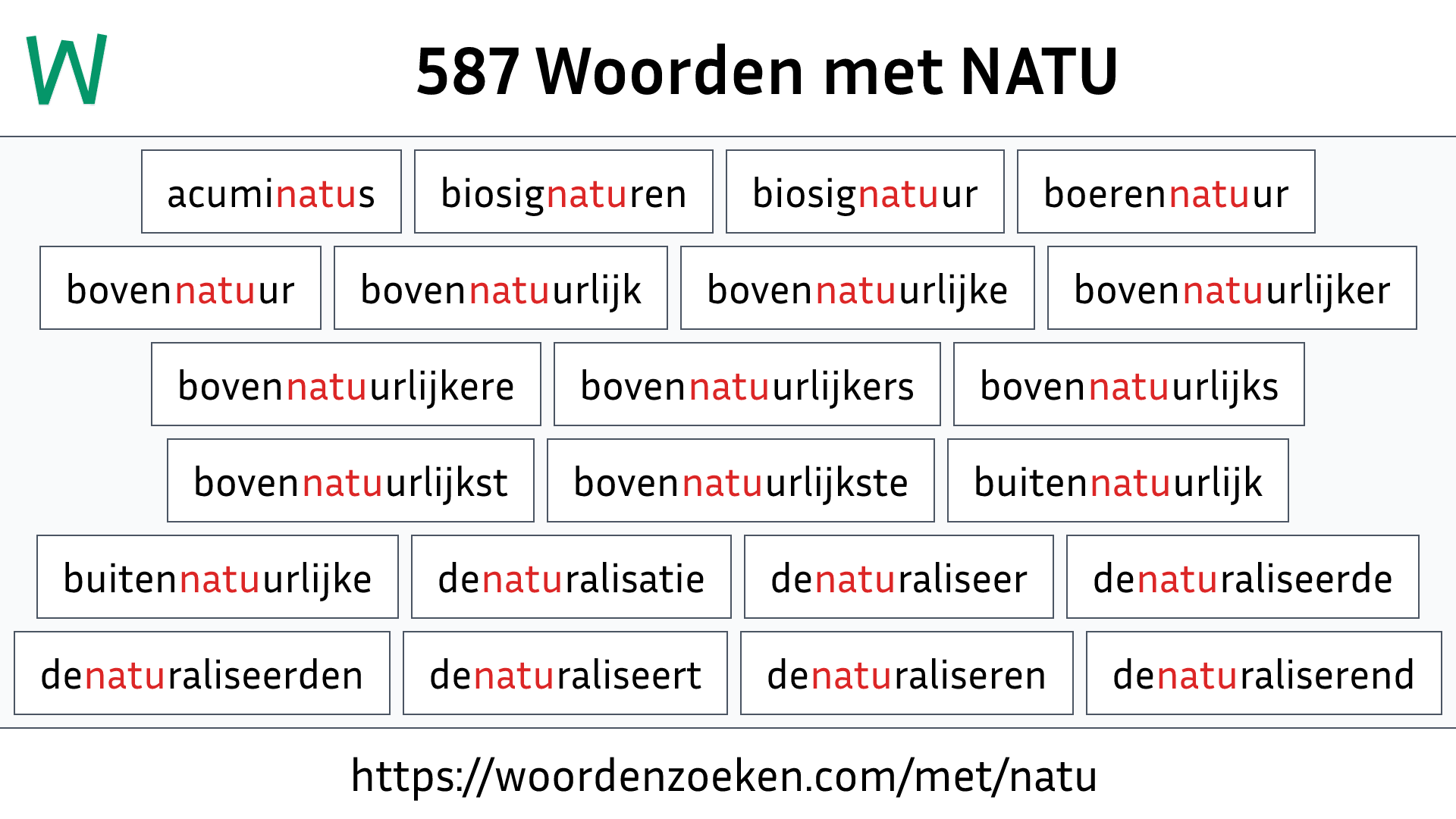 Hieronder staat een lijst van 587 Nederlandse woorden met NATU. Als je spellen speelt zoals Wordfeud, Scrabble, uitdagende kruiswoordpuzzels maakt, of op zoek bent naar een specifiek woord, dan kan deze lijst handig voor je zijn. Wil je de zoekfilters aanpassen om meer woorden te bevatten of een specifiek woord te vinden? Wijzig de filters in het formulier op deze pagina en klik op "Zoeken".