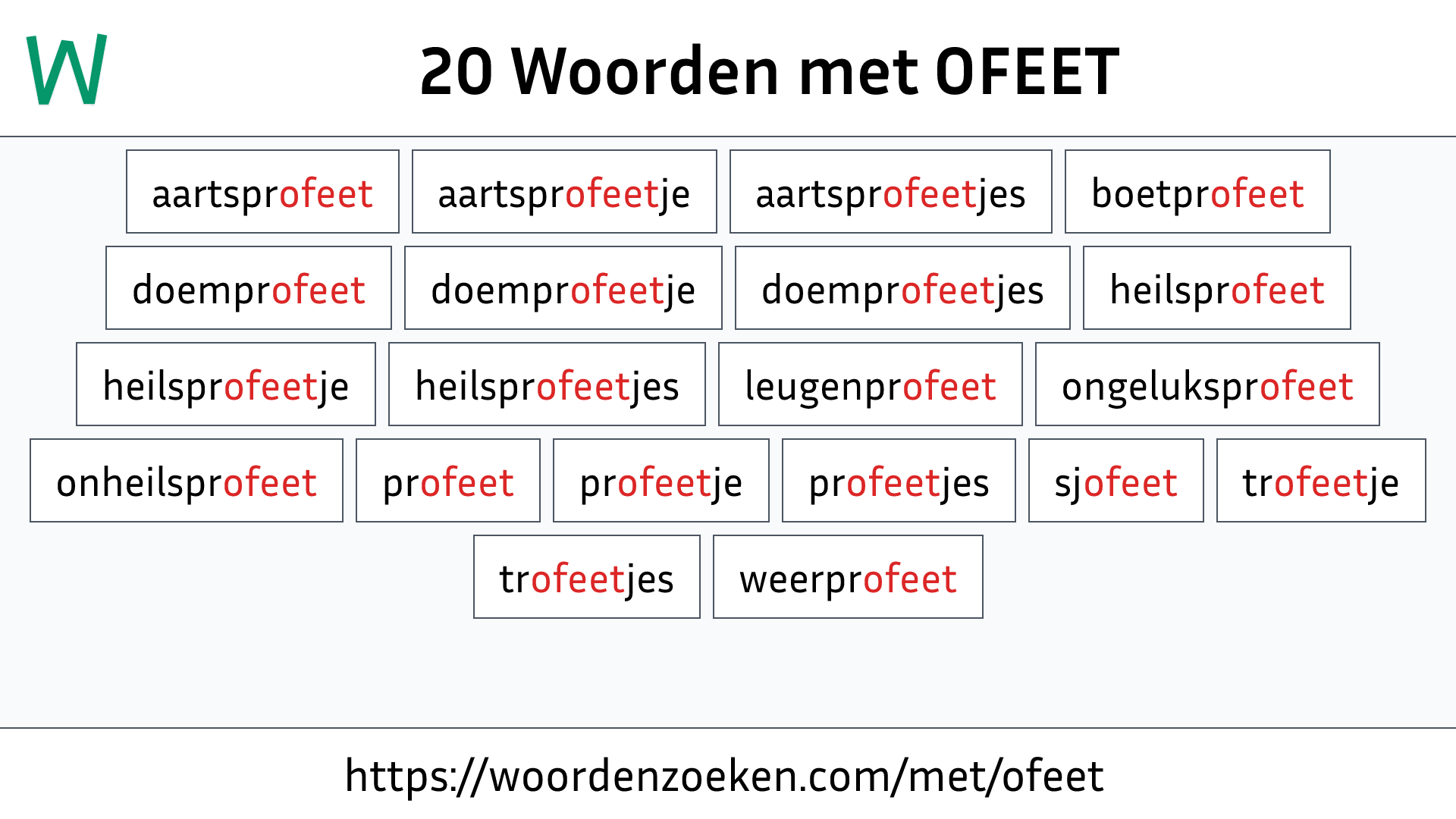 Hieronder staat een lijst van 20 Nederlandse woorden met OFEET. Als je spellen speelt zoals Wordfeud, Scrabble, uitdagende kruiswoordpuzzels maakt, of op zoek bent naar een specifiek woord, dan kan deze lijst handig voor je zijn. Wil je de zoekfilters aanpassen om meer woorden te bevatten of een specifiek woord te vinden? Wijzig de filters in het formulier op deze pagina en klik op "Zoeken".
