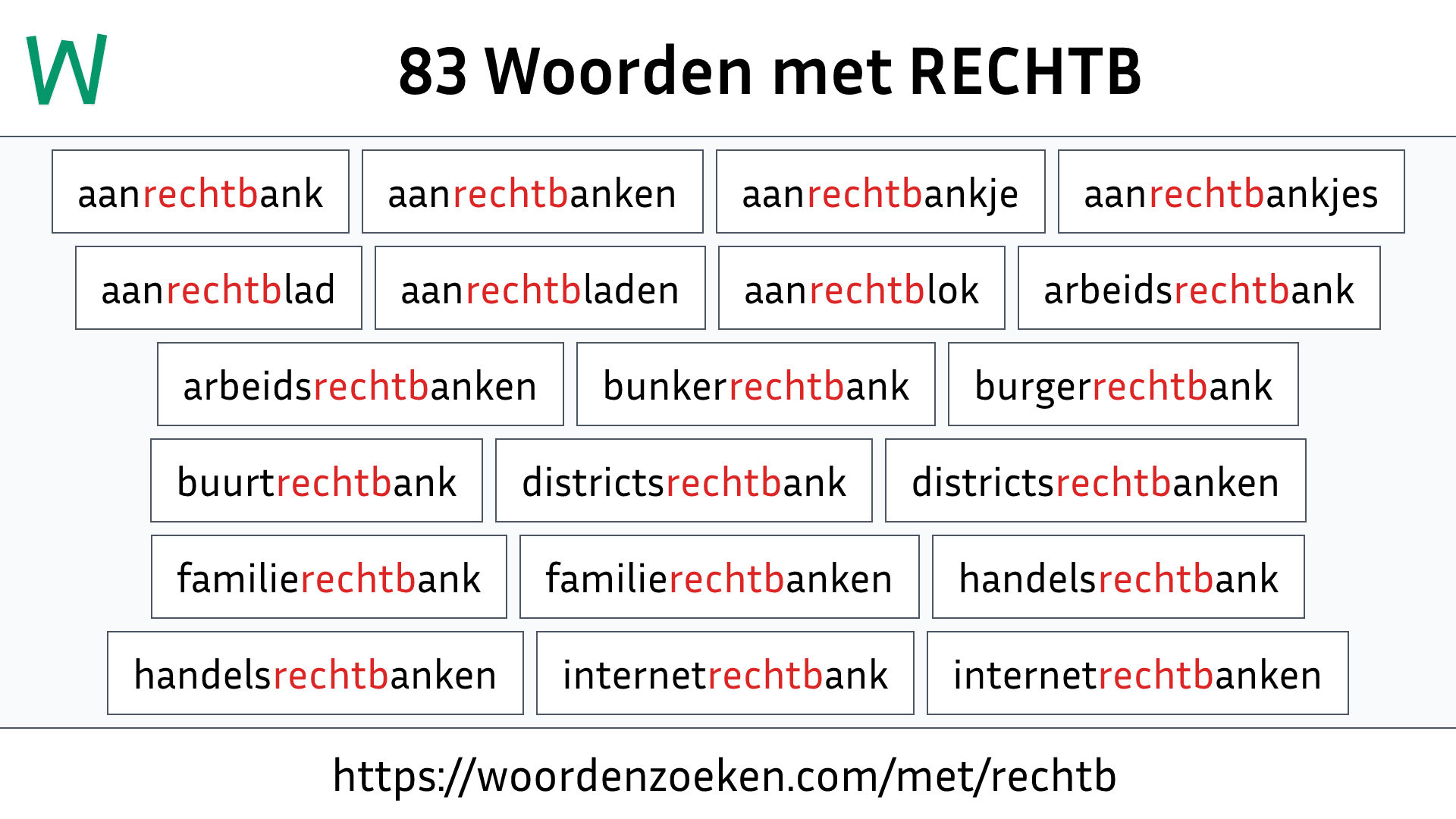 Hieronder staat een lijst van 83 Nederlandse woorden met RECHTB. Als je spellen speelt zoals Wordfeud, Scrabble, uitdagende kruiswoordpuzzels maakt, of op zoek bent naar een specifiek woord, dan kan deze lijst handig voor je zijn. Wil je de zoekfilters aanpassen om meer woorden te bevatten of een specifiek woord te vinden? Wijzig de filters in het formulier op deze pagina en klik op "Zoeken".