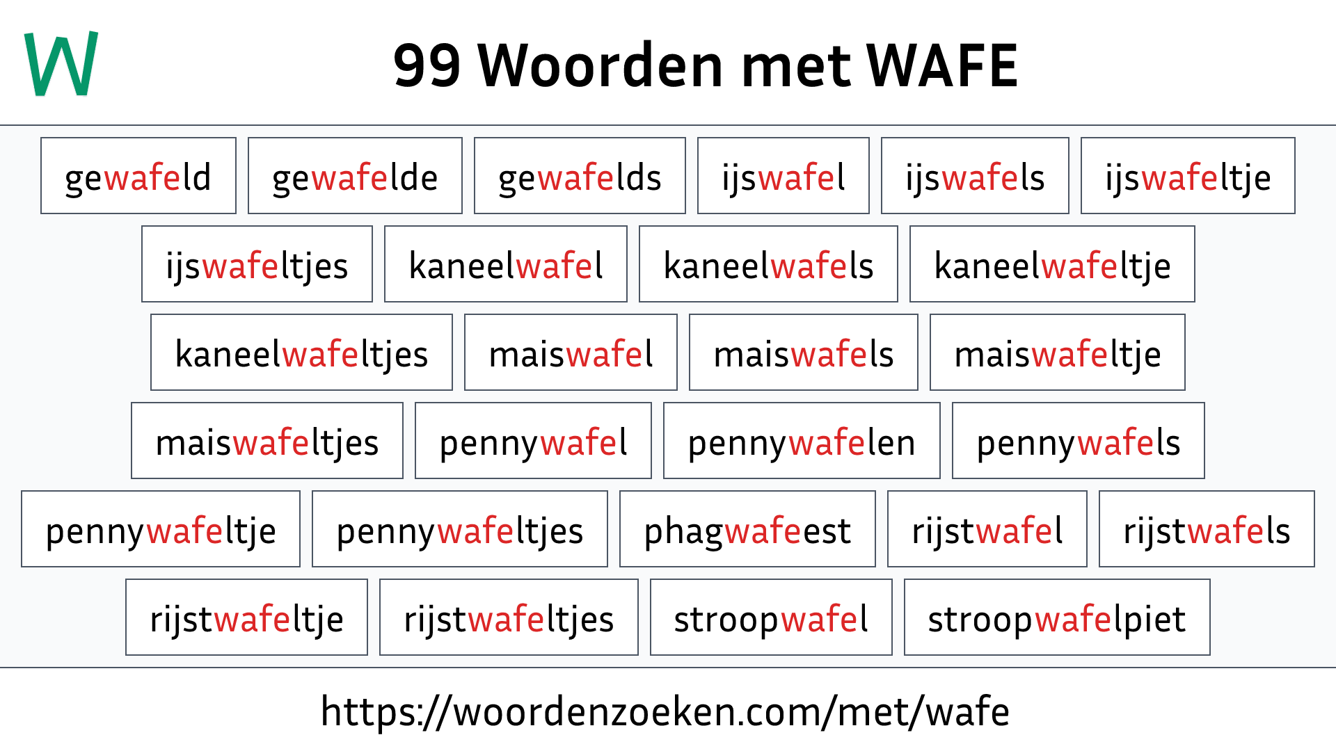 Hieronder staat een lijst van 99 Nederlandse woorden met WAFE. Als je spellen speelt zoals Wordfeud, Scrabble, uitdagende kruiswoordpuzzels maakt, of op zoek bent naar een specifiek woord, dan kan deze lijst handig voor je zijn. Wil je de zoekfilters aanpassen om meer woorden te bevatten of een specifiek woord te vinden? Wijzig de filters in het formulier op deze pagina en klik op "Zoeken".